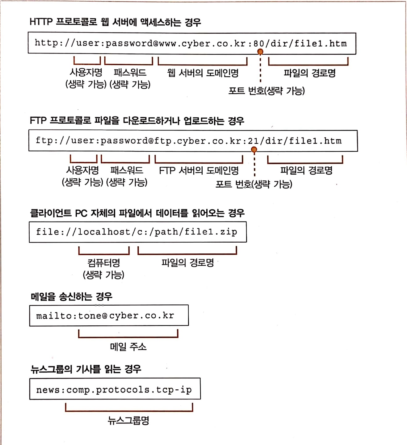 http://로 시작하는 것으로 생각한다. 하지만 URL은 그 밖에도ftp:,mailto:등 여러 문자로 시작할 수 있다. 이처럼 다양한 형태의 URL이 있는 이유가 있다.브라우저를 웹 서버에 엑세스하는 클라이언트로 사용하는 경우가 많지만, 브라우저의 기능은 그 밖에도 파일을 다운로드/업로드하는 FTP의 클라이언트 기능, 메일의 클라이언트 기능 등을 가지고 있다. 브라우저는 몇 개의 클라이언트 기능을 겸비한 복합적인 클라이언트 소프트웨어 라고 할 수 있다.